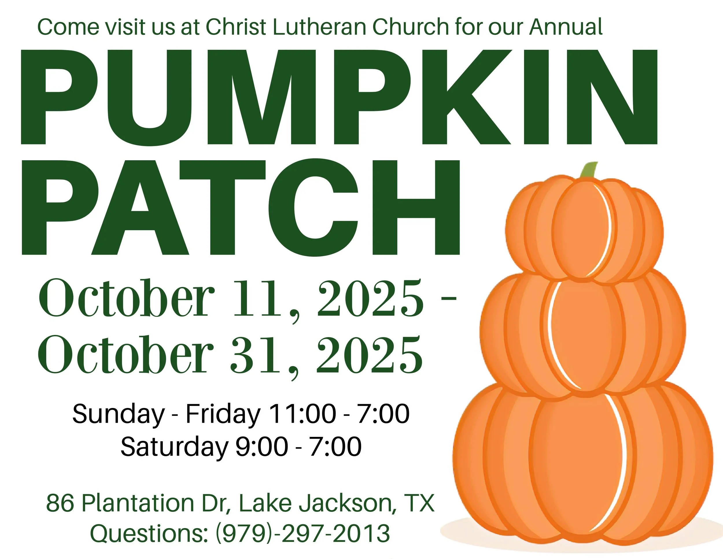 Christ Lutheran ChurchLake Jackson, TX Our mission: To be the hands of Christ, together welcoming, worshiping, learning, serving, and supporting each other.Our vision: To be a place of grace for everyone. If you are a youth who would like to work at the Pumpkin Patch, please fill out this application. Live Worship Stream 〰️ Worship Service at 10:00am, Sunday Mornings 〰️ Worship Service at 10:00am, Sunday Mornings 〰️ Worship Service at 10:00am, Sunday Mornings